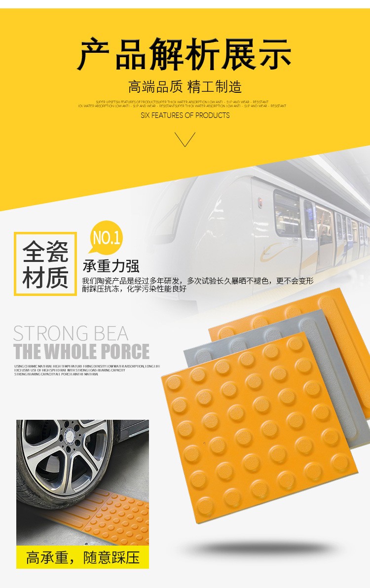 火車站站臺止步線國家標準寬度是600毫米寬,所以一般盲道磚規格都是600毫米的倍數,比如有常用的300*300*20.300*300*25,以及400*400;300*400等。 這種盲道磚的成型方法是干粉制胚,壓制成型。